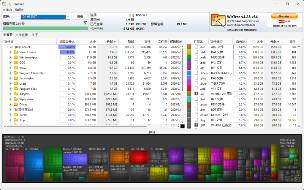 我的D盘爆红,一直手动删除了很多没有使用的软件,还是爆红。今天用WizTree扫描就明白了,原来是Steam游戏占满了D盘空间,几秒就能出结果,界面非常美观清晰。